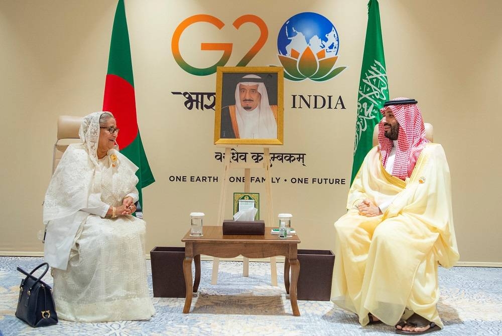 التقى ولي العهد رئيس مجلس الوزراء رئيس وفد السعودية المشارك في قمة قادة دول مجموعة العشرين الأمير محمد بن سلمان بن عبدالعزيز آل سعود، في مدينة نيودلهي بجمهورية الهند، اليوم (الأحد)، رئيسة وزراء جمهورية بنغلاديش الشعبية الشيخة حسينة واجد.