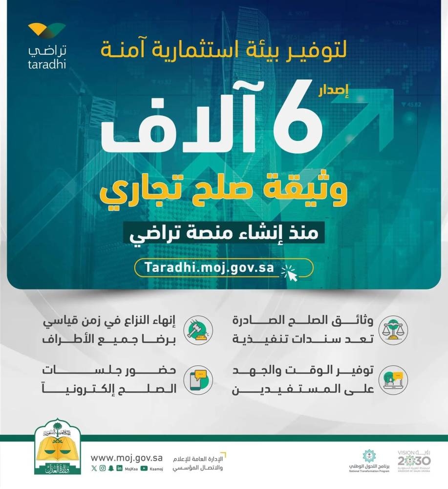 نجحت وزارة العدل، من خلال مركز المصالحة، في إنهاء أكثر من 6 آلاف قضية تجارية صلحًا، عبر منصة «تراضي» الإلكترونية، بعيدًا عن الدعاوى القضائية، وأروقة المحاكم، من خلال إجراءات ميسرة وسريعة، وذلك تحقيقًا لمستهدفات مبادرة «تفعيل منظومة المصالحة»، إحدى مبادرات برنامج التحول الوطني, ضمن رؤية السعودية 2030.