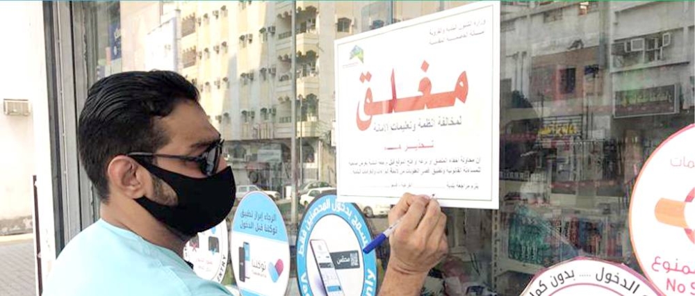 مراقب صحي بأمانة العاصمة المقدسة يغلق محلاً مخالفاً. (موقع الأمانة)