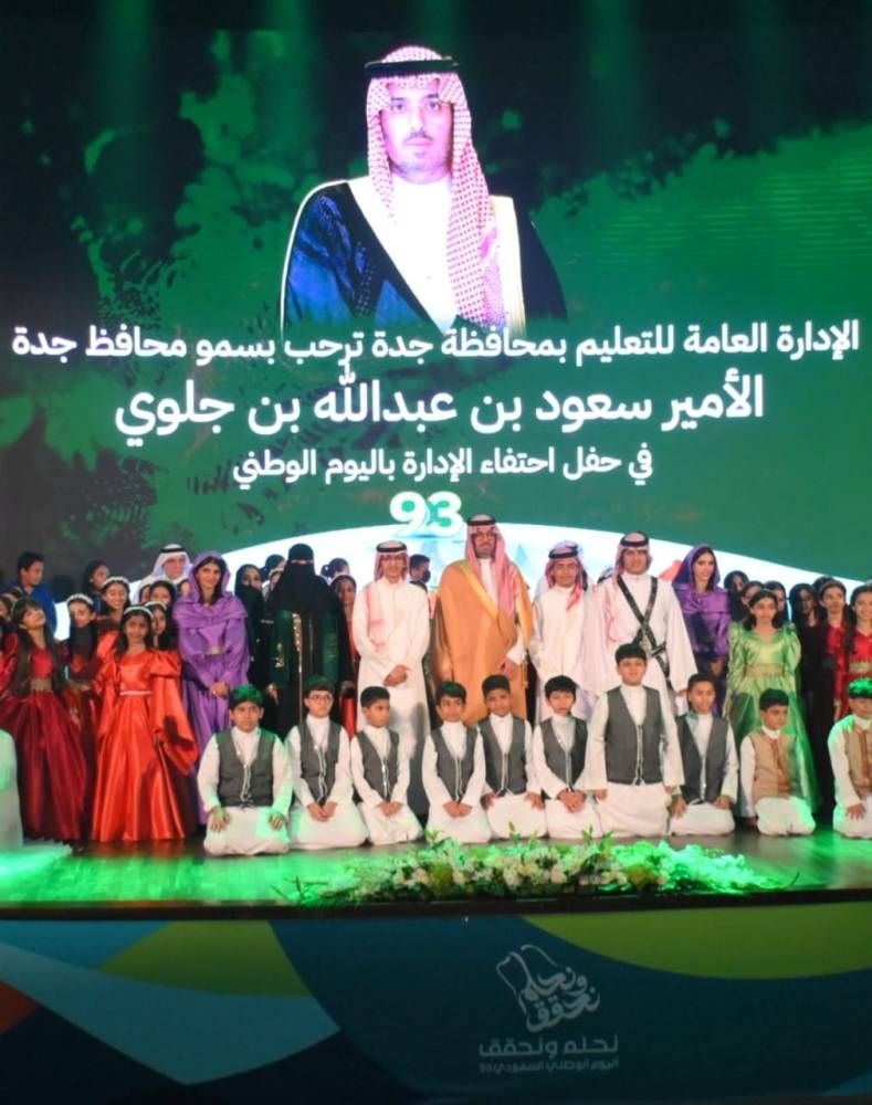 رعى محافظ جدة سعود بن عبدالله بن جلوي، اليوم، الحفل الذي أقامته الإدارة العامة للتعليم بجدة بمناسبة اليوم الوطني الـ 93 تحت شعار «نحلم ونحقق»، بحضور المدير العام للتعليم بجدة منال بنت مبارك اللهيبي، وقيادات وطلاب وطالبات التعليم بالمحافظة، وذلك بمسرح أكاديمية وعد.