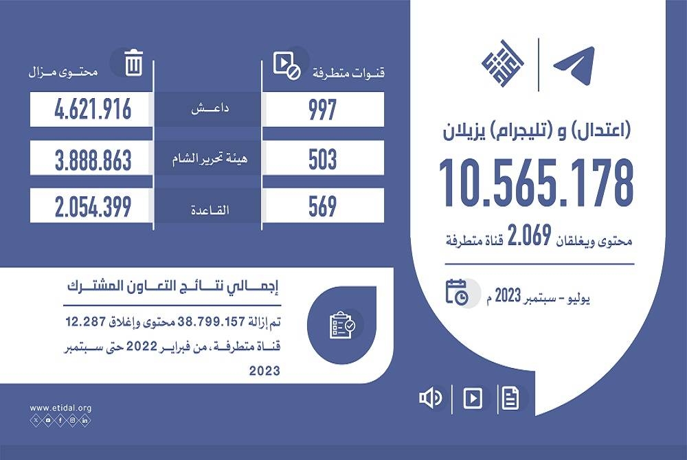 تمكن المركز العالمي لمكافحة الفكر المتطرف (اعتدال) ومنصة «تليجرام» عبر مواصلة جهودهما في التصدي للأنشطة الدعائية للتنظيمات المتطرفة، من إزالتهما 10,565,178 محتوى متطرفاً وإغلاق 2069 قناة استخدمت في نشر وترويج المحتويات المتطرفة، وذلك خلال الربع الثالث من العام الحالي 2023 (يوليو – سبتمبر).
