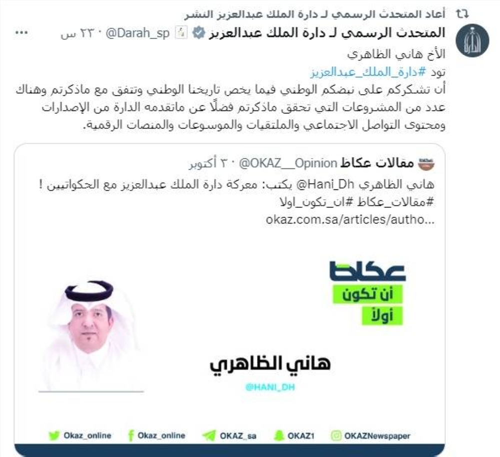 تقدمت دارة الملك عبدالعزيز على لسان متحدثها الرسمي عبر حسابه بموقع التواصل الاجتماعي «X»، بالشكر للكاتب بصحيفة «عكاظ» هاني الظاهري، على مقاله المنشور بتاريخ الثلاثاء 03 أكتوبر 2023، تحت عنوان «معركة دارة الملك عبدالعزيز مع الحكواتيين!».