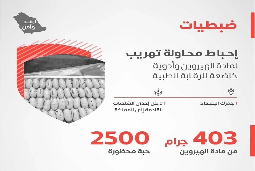 تمكنت هيئة الزكاة والضريبة والجمارك في منفذ البطحاء من إحباط محاولة تهريب 403 غرامات من مادة الهيروين المخدرة و2500 حبة خاضعة للرقابة الطبية.