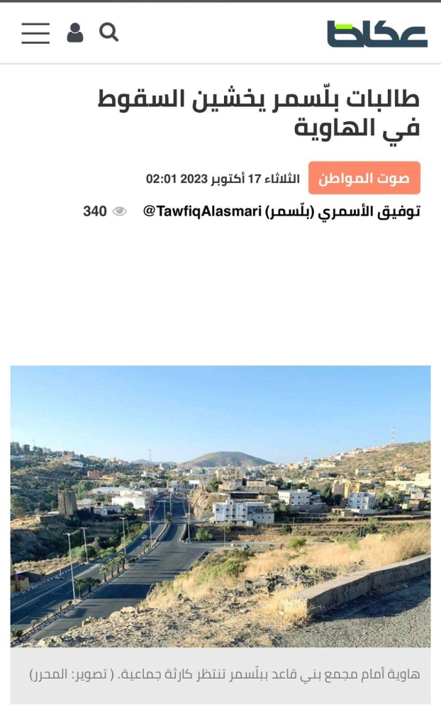 وكانت «عكاظ» قد نقلت تخوّف طالبات ومنسوبات مجمع بني قاعد في بلّسمر من السقوط في حفر عميقة وصفنها بالهاوية الخطيرة، أمام مواقف الباصات وتُحيط بالمجمع من أغلب الجهات، وتتحوّل يومياً إلى مأزق كبير للطالبات، الأمر الذي قد ينتهي بحسب وصفهن بكارثة جماعية يذهب ضحيتها الأبرياء من الطالبات وقائدي الباصات وأيضاً أولياء أمور الطالبات.