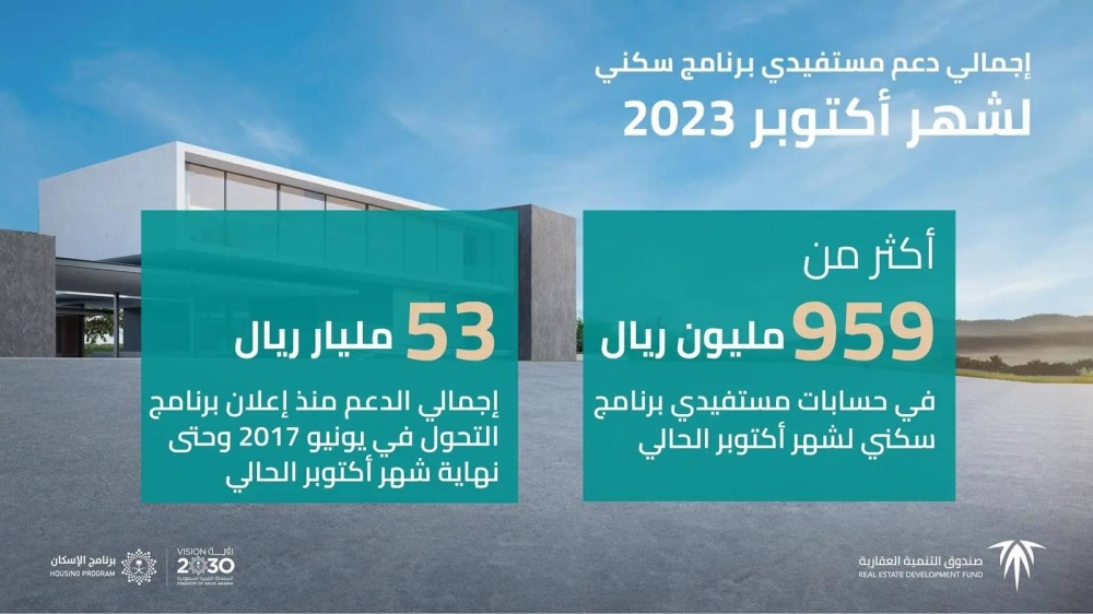 وأوضح الرئيس التنفيذي للصندوق العقاري منصور بن ماضي، أن إجمالي الدعم لشهر أكتوبر بلغ 959 مليون ريال، خُصصت دعماً لأرباح عقود التمويل العقاري، مبيناً أن إجمالي ما تم إيداعه في حسابات مستفيدي سكني منذ إعلان برنامج التحوّل في يونيو 2017 حتى شهر أكتوبر 2023م بلغ أكثر من 53 مليار ريال.