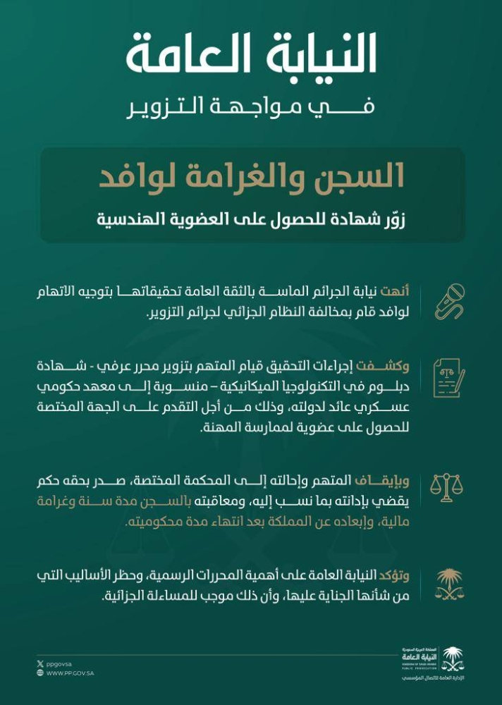 أنهت نيابة الجرائم الماسة بالثقة العامة تحقيقاتها بتوجيه الاتهام لوافد خالف النظام الجزائي لجرائم التزوير.