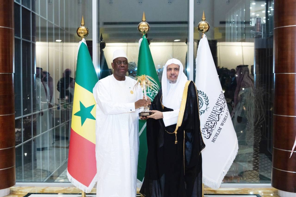 الرئيس السنغالي يتسلم مجسَّمَ أيقونة وثيقة مكة من أمين عام رابطة العالم الإسلامي. (واس)
