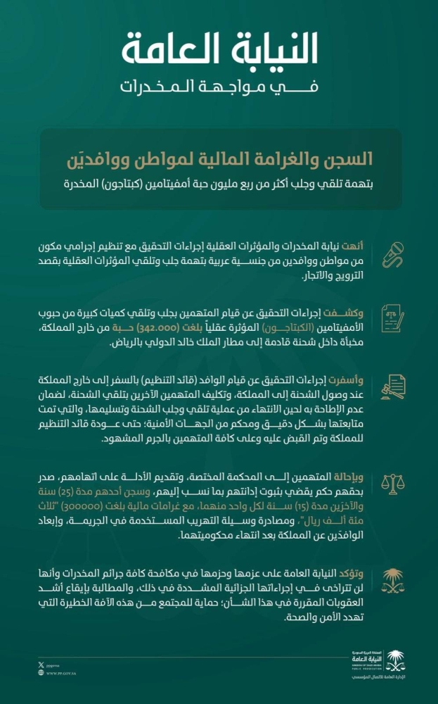 النيابة العامة: السجن 55 عاما لمواطن ووافدين جلبوا 342 ألف حبة كبتاجون مخدرة للسعودية