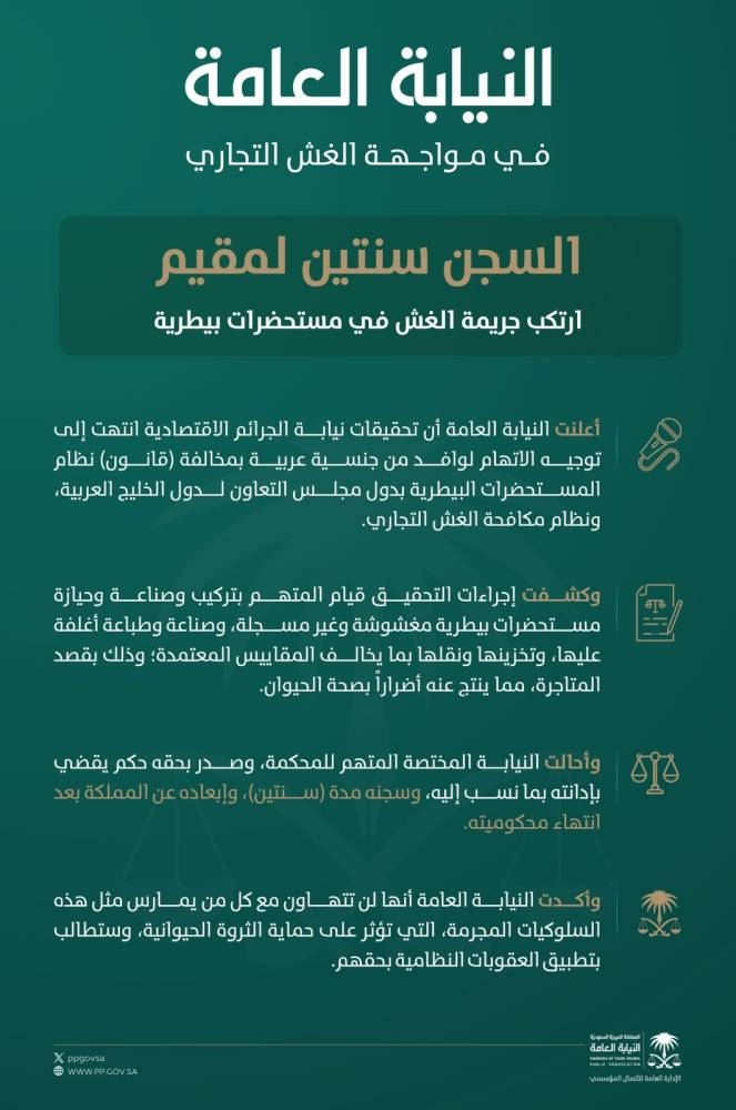 أعلنت النيابة العامة أن تحقيقات نيابة الجرائم الاقتصادية انتهت إلى توجيه الاتهام لوافد من جنسية عربية بمخالفة (قانون) نظام المستحضرات البيطرية بدول مجلس التعاون لدول الخليج العربية، ونظام مكافحة الغش التجاري.