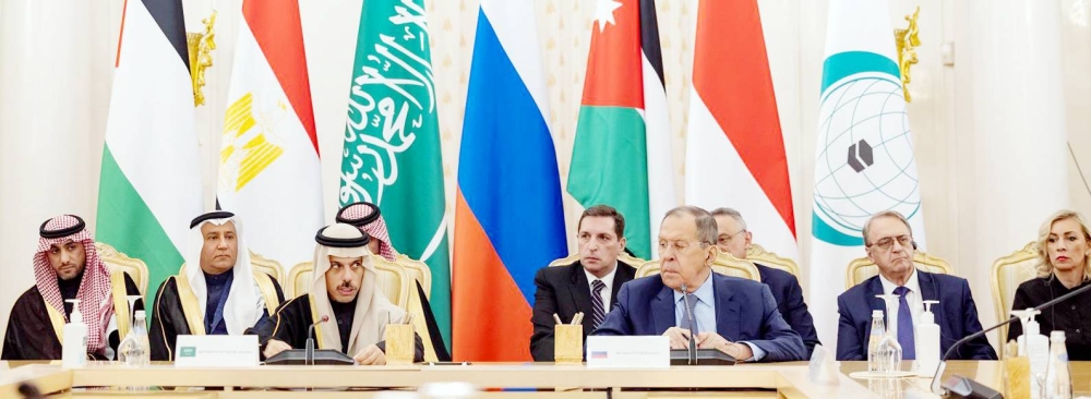 اللجنة الوزارية المكلفة من القمة العربية الإسلامية المشتركة خلال اجتماعها مع وزير خارجية روسيا. (واس)