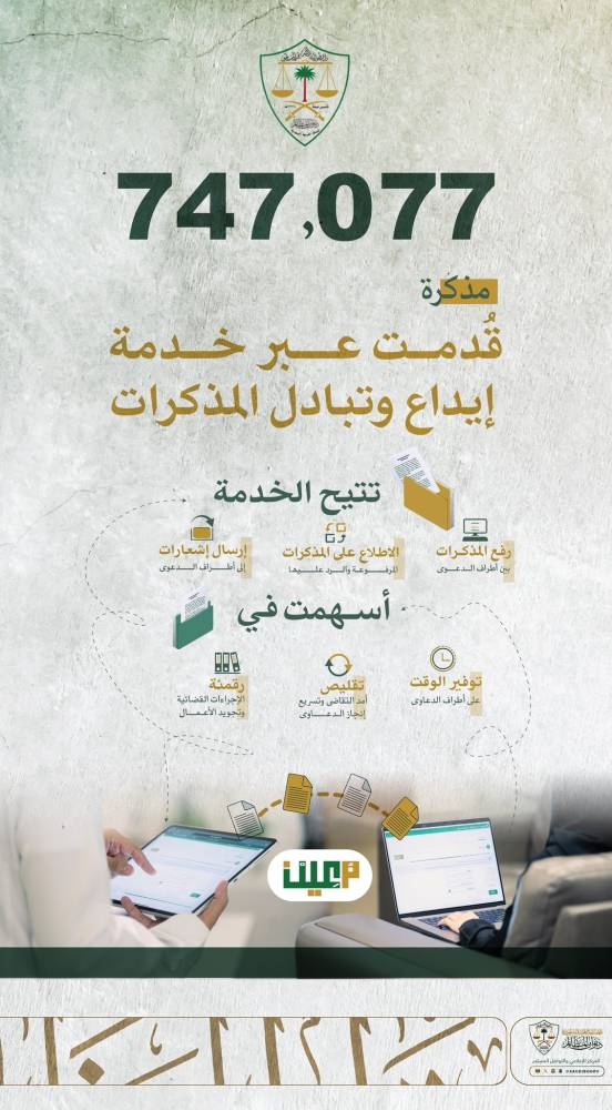 ويحرص ديوان المظالم من خلال خدمة إيداع وتبادل المذكرات في منصة معين الرقمية على توفير الوقت والجهد لأطراف الدعاوى، وما يترتب عليه من تقليص لآماد التقاضي نتاج رقمنة الإجراءات وتطويرها وما يمكن أن تسهم به من تدقيق تلك الإجراءات وسرعة تنفيذها في سبيل تحقيق المستهدف الأول لديوان المظالم والمتمثل في العدالة الناجزة.