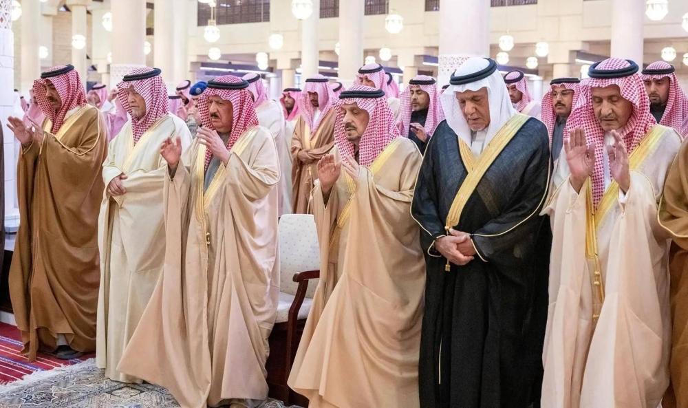 وأدى الصلاة مع أمير منطقة الرياض، الأمير تركي بن فيصل بن عبدالعزيز، والأمير سعود بن سعد بن عبدالعزيز، ومستشار خادم الحرمين الشريفين الأمير خالد بن بندر بن عبدالعزيز، والأمير متعب بن عبدالله بن عبدالعزيز، والأمير فهد بن عبدالله بن محمد بن عبدالرحمن، والأمير خالد بن سعد بن عبدالعزيز، والأمير متعب بن ثنيان بن محمد، ومستشار خادم الحرمين الشريفين الأمير فيصل بن خالد بن عبدالعزيز، والأمير منصور بن ناصر بن عبدالعزيز، والأمير سعود بن عبدالله بن ثنيان، والأمير سطام بن سعود بن عبدالعزيز، والأمير تركي بن محمد بن عبدالله بن عبدالرحمن، والأمير أحمد بن عبدالله بن عبدالرحمن، وأمير منطقة الباحة الأمير حسام بن سعود بن عبدالعزيز، والأمير خالد بن سعود بن خالد بن محمد، والأمير محمد بن سعود بن خالد بن محمد، والأمير محمد بن فيصل بن بندر بن عبدالعزيز، وأمير منطقة المدينة المنورة الأمير سلمان بن سلطان بن عبدالعزيز، والأمير نايف بن سلطان بن عبدالعزيز، ونائب وزير الدفاع الأمير عبدالرحمن بن محمد بن عيّاف.