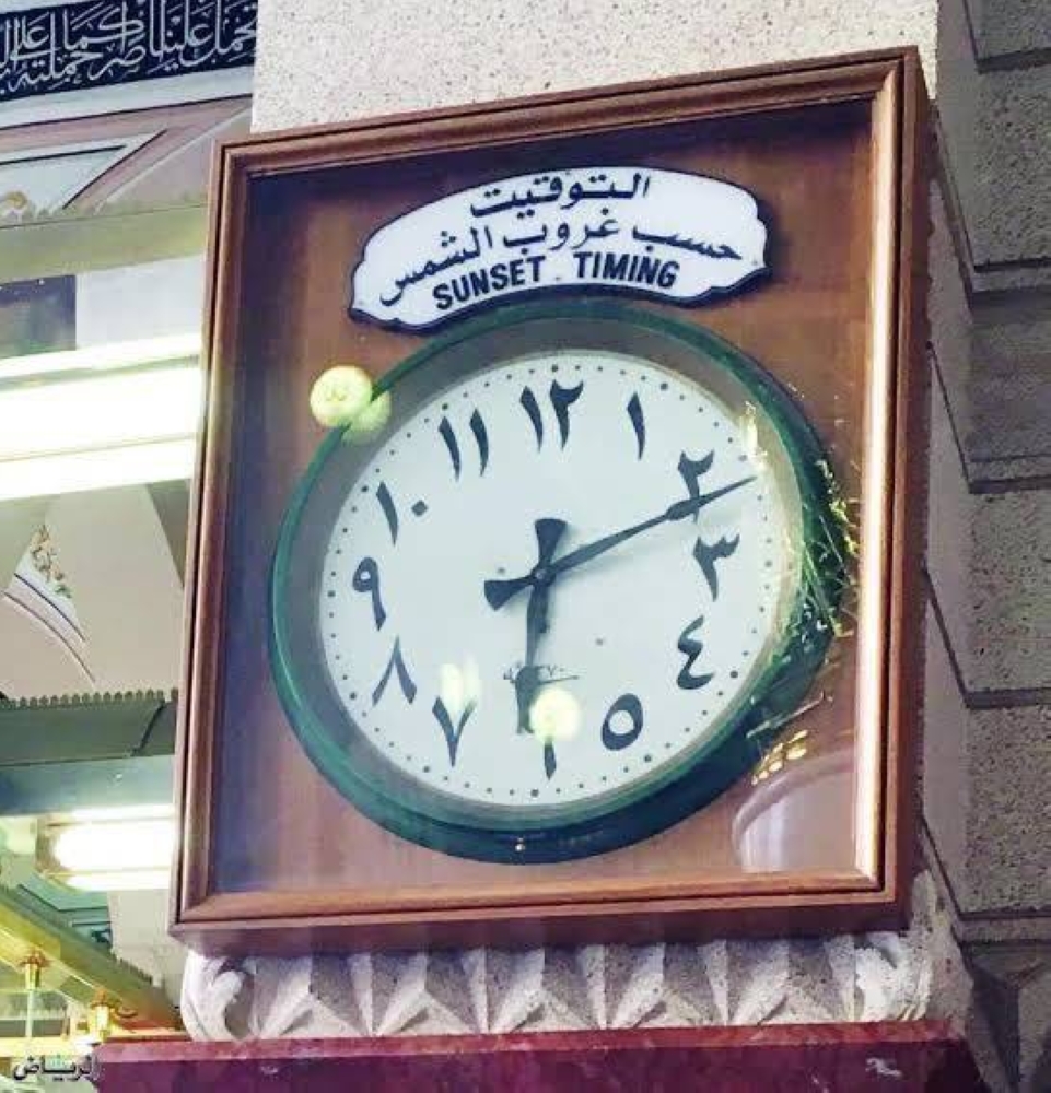 وأضاف، المسجد النبوي ما زال يحتفظ بعدد من الساعات التي تعتمد على التوقيت الغروبي أو التوقيت العربي، ولم تغن عنها ساعات التوقيت العالمي، كونها مرجعاً في تحديد أوقات الصلاة ومعرفة مواعيد الشروق والغروب، وقد اعتاد أهالي المدينة على معايرة وتعشيت ساعاتهم مع غروب الشمس وقت أذان مغرب كل يوم، ويتم معايرة الساعة بالضبط اليدوي بحسب زيادة النهار ونقصانه تبعاً لتغيرات الفصول في الشتاء والصيف، ويلاحظ أنه لا بد لهذه المهمة من موظف مختص، وهذا ما كان عليه سابقاً.