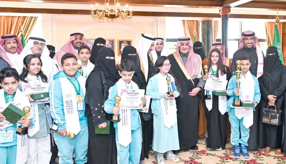 الأمير فهد بن سلطان مع طلاب وطالبات مدارس الملك عبدالعزيز النموذجية الحاصلين على المراكز الثلاثة الأولى في المسابقة العالمية للحساب الذهني والتي أقيمت مؤخراً بماليزيا. (واس)
