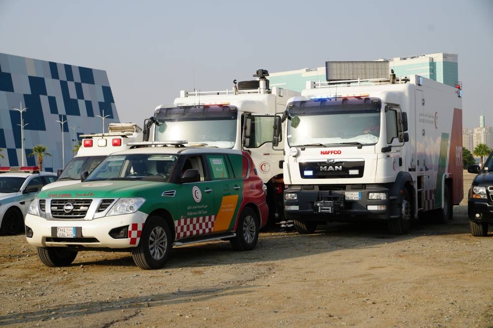 سيارات الهلال الأحمر تستعد للحالة المطرية. (عكاظ)
