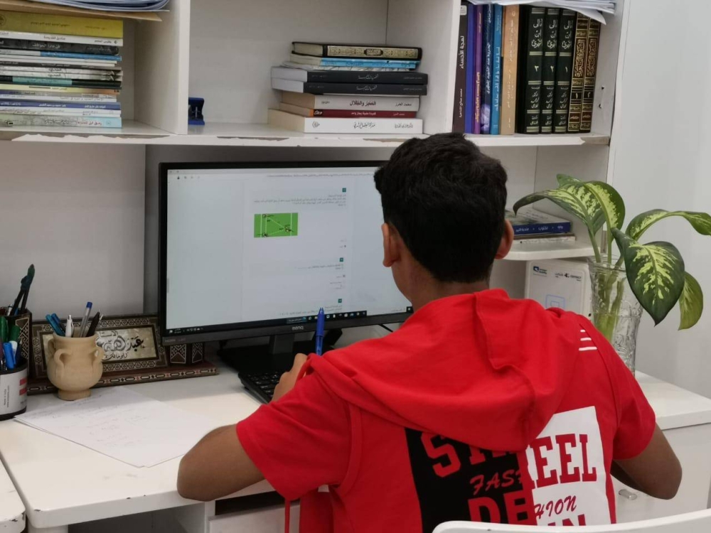 طالب في المرحلة المتوسطة يؤدي الاختبار عبر منصة مدرستي. (أرشيف عكاظ)