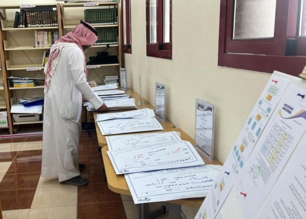 مدير مدرسة يتأكد من قوائم الطلاب المتقدمين للاختبارات. (عكاظ)