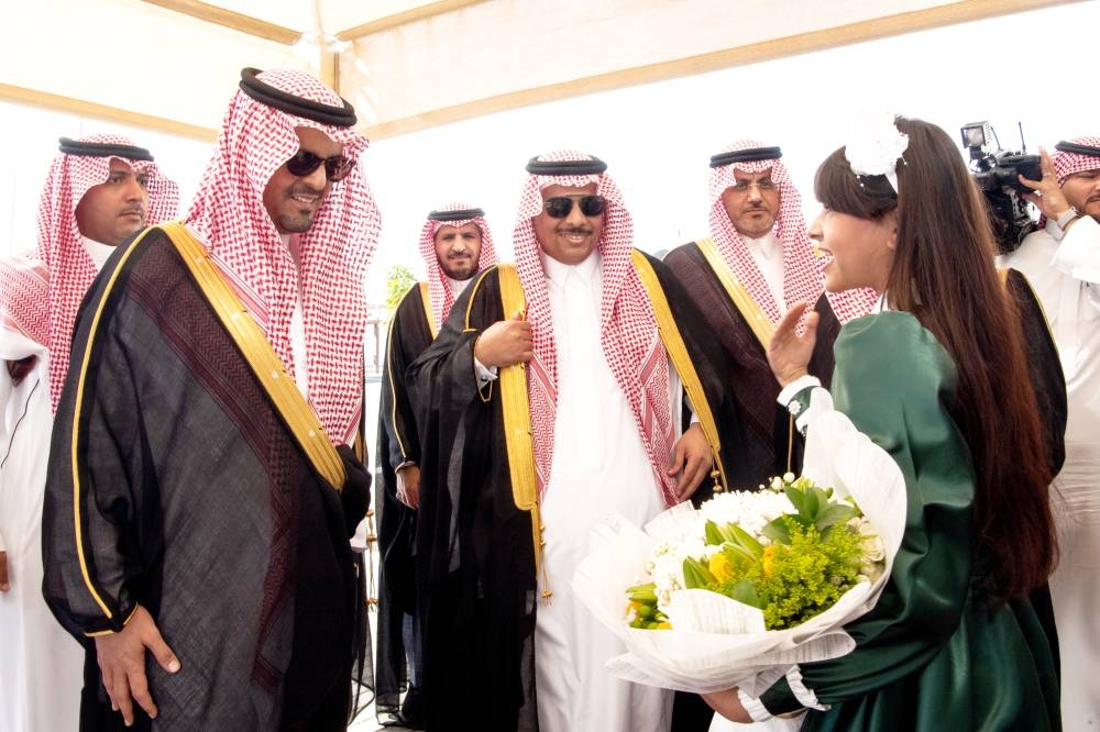 الأمير سعود بن مشعل يتلقى باقة ورد من طفلة. (واس)