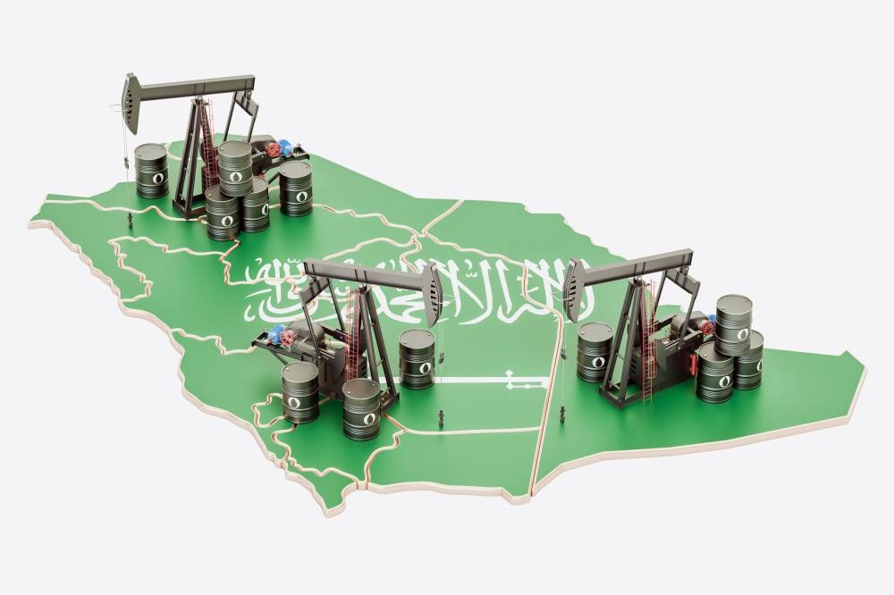 Saudi Arabia map with oil barrels and pumpjacks. Oil production concept. 3D rendering