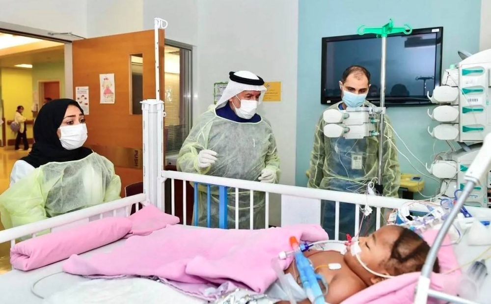 وأضاف الدكتور الربيعة أن التوأم ما زالتا بالعناية المركزة وتحت المخدر وتخضعان للتغذية الوريدية والأدوية اللازمة لضمان استقرار حالتهما، إلا أن جميع المؤشرات الطبية للتوأم مطمئنة ولله الحمد، مشيرًا إلى أن الفريق الطبي المعالج يتابع بشكل دقيق الوضع الصحي للتوأم في وحدة العناية المركزة للأطفال، مؤكدًا أن التوأم يحتاج للرقابة المشددة قرابة 10 أيام إلى أسبوعين، وبعد ذلك يتم تقييم حالتهما للانتقال من العناية المركزة إلى جناح الأطفال. كما قام الدكتور الربيعة بإيضاح حالة التوأم الصحية لوالديهما.
