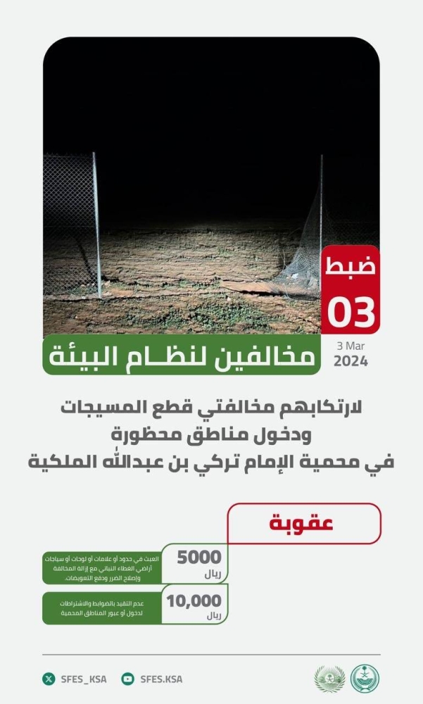 وأوضحت «القوات» أنه تم تطبيق الإجراءات النظامية بحقهم، وتسليم المضبوطات للجهات المختصة، مؤكدةً أن عقوبة عدم التقيد بالضوابط والاشتراطات لدخول أو عبور المناطق المحمية غرامة (10,000) ريال، وأن عقوبة العبث في حدود أو علامات أو لوحات أو سياجات أراضي الغطاء النباتي غرامة (5,000) ريال، مع إزالة المخالفة وإصلاح الضرر ودفع التعويضات.