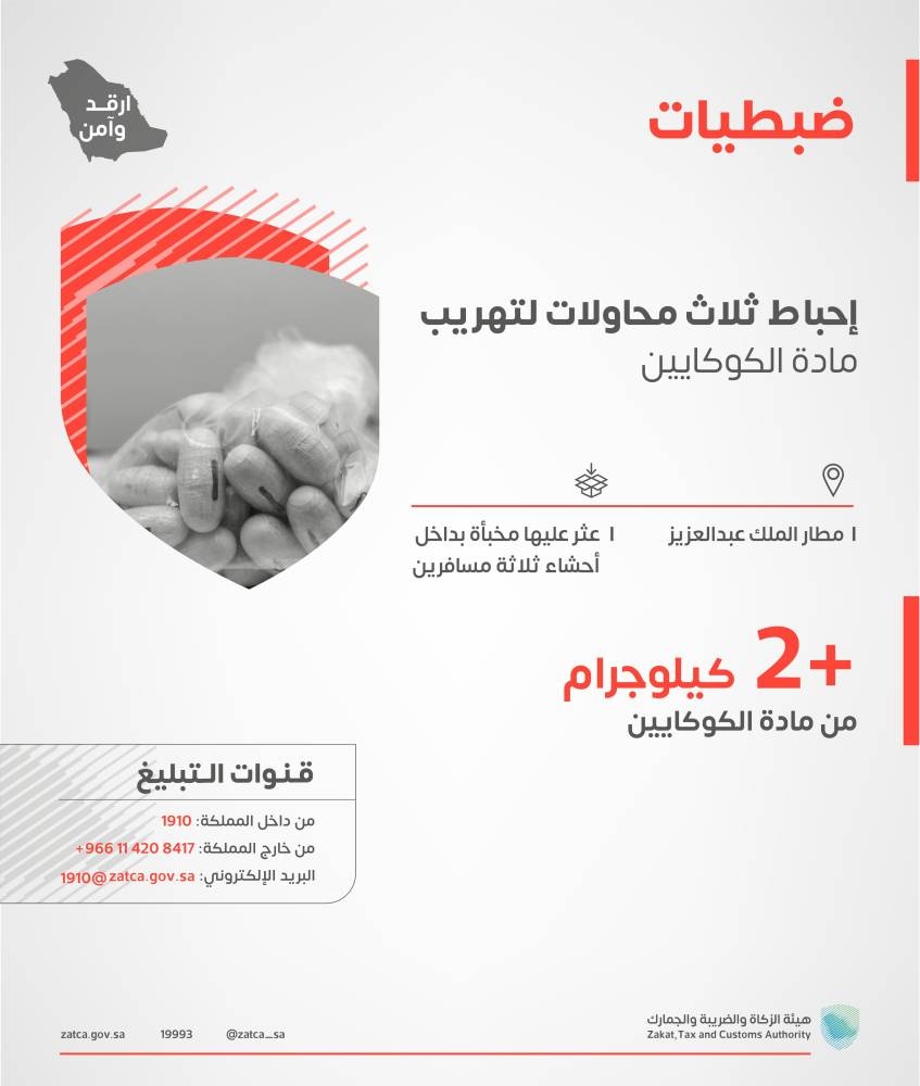 تمكّنت هيئة الزكاة والضريبة والجمارك في مطار الملك عبدالعزيز الدولي بجدة من إحباط عدد من المحاولات لتهريب أكثر من كيلوجرامين من الكوكايين، و878.2 جرام من الهيروين، عُثر عليها جميعًا مُخبأة داخل أحشاء مسافرين قدموا إلى المملكة عبر مطار الملك عبدالعزيز الدولي بجدة.