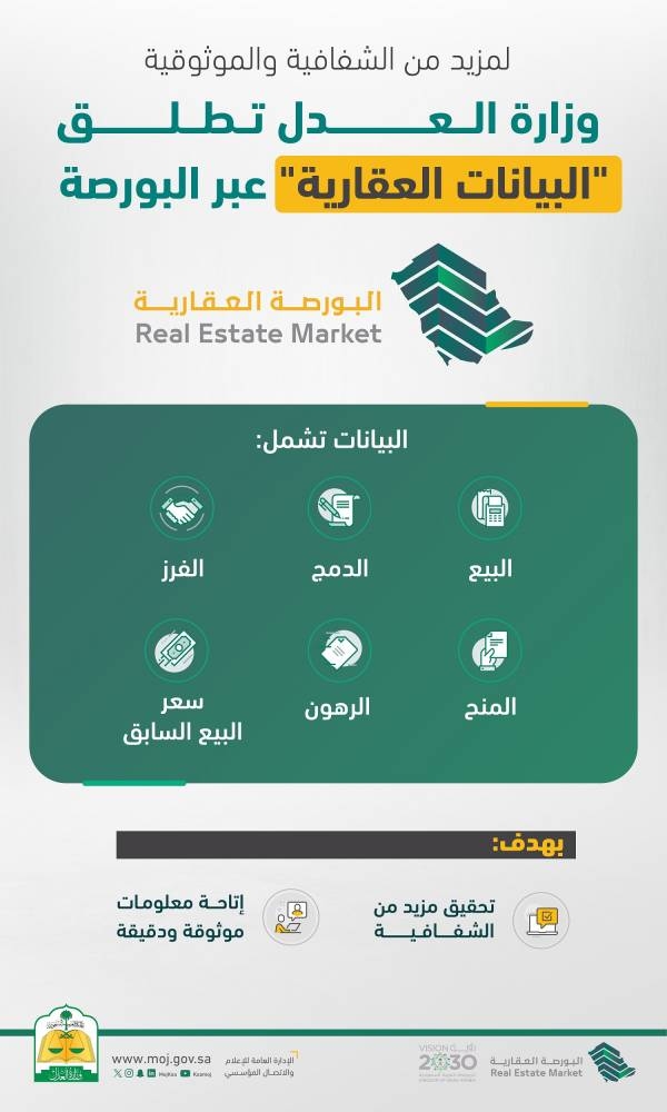 أطلقت وزارة العدل السجل الزمني لجميع تفاصيل العمليات التوثيقية التي أجريت على العقار «البيانات العقارية» عبر البورصة العقارية.