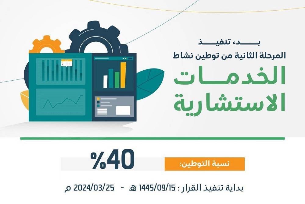 أعلنت وزارة الموارد البشرية والتنمية الاجتماعية، دخول المرحلة الثانية من قرار توطين مهن الخدمات الاستشارية حيز التنفيذ بنسبة 40%، وذلك اعتبارا من اليوم (الاثنين) تاريخ 2024/3/25، ضمن مساعي الوزارة الهادفة إلى توفير مزيد من فرص العمل المحفزة والمُنتجة للمواطنين والمواطنات في مختلف مناطق السعودية.
