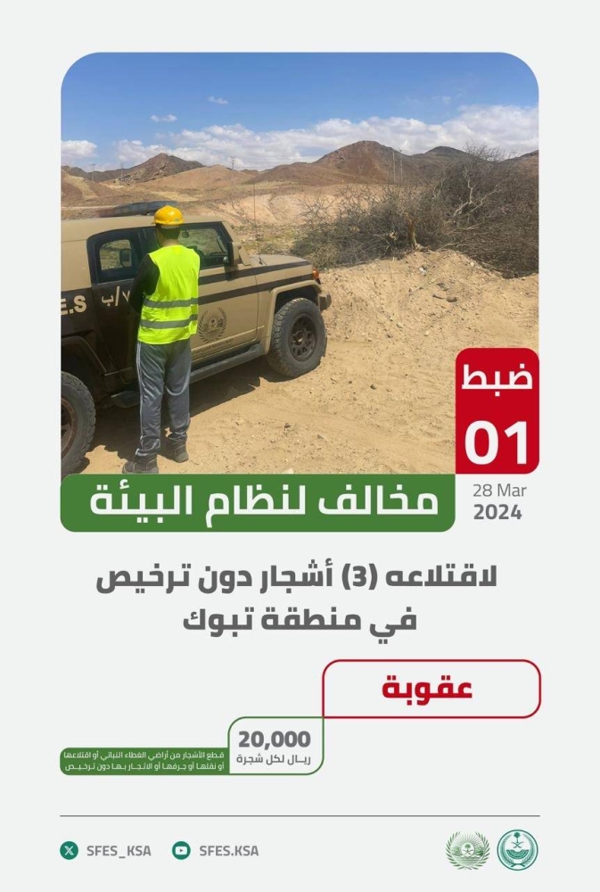 ضبطت القوات الخاصة للأمن البيئي مقيما مخالفا لنظام البيئة من الجنسية الباكستانية لاقتلاعه 3 أشجار دون ترخيص في منطقة تبوك.