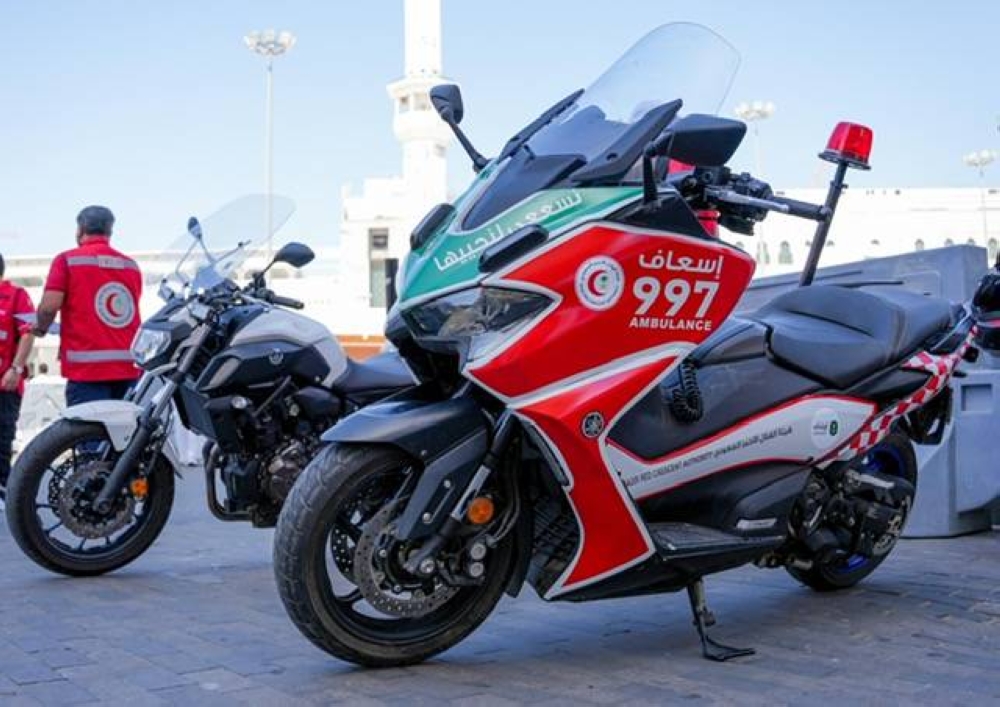 وتمتلك هيئة الهلال الأحمر، أسطولاً إسعافياً مجهزاً بأحدث التقنيات الإسعافية لمواجهة الكوارث والأزمات الطارئة، ويتكوّن من عدة حافلات وعربات مجهزة تجهيزاً كاملاً للتعامل مع مختلف الحالات الطارئة، إضافة إلى مركبات الإسعاف وعربات الدفع الرباعي وعربات الجولف والدراجات النارية والهوائية والاسكوترات.
