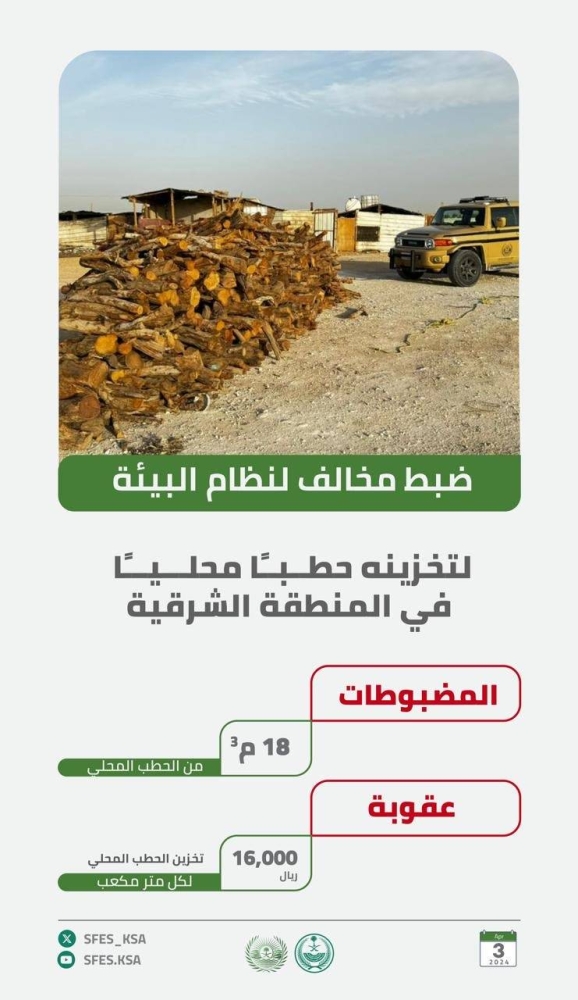ضبطت القوات الخاصة للأمن البيئي مقيمًا مخالفًا لنظام البيئة من الجنسية الهندية، لارتكابه مخالفة تخزين أكثر من 18 مترًا مكعبًا من الحطب المحلي في المنطقة الشرقية، وجرى اتخاذ الإجراءات النظامية.