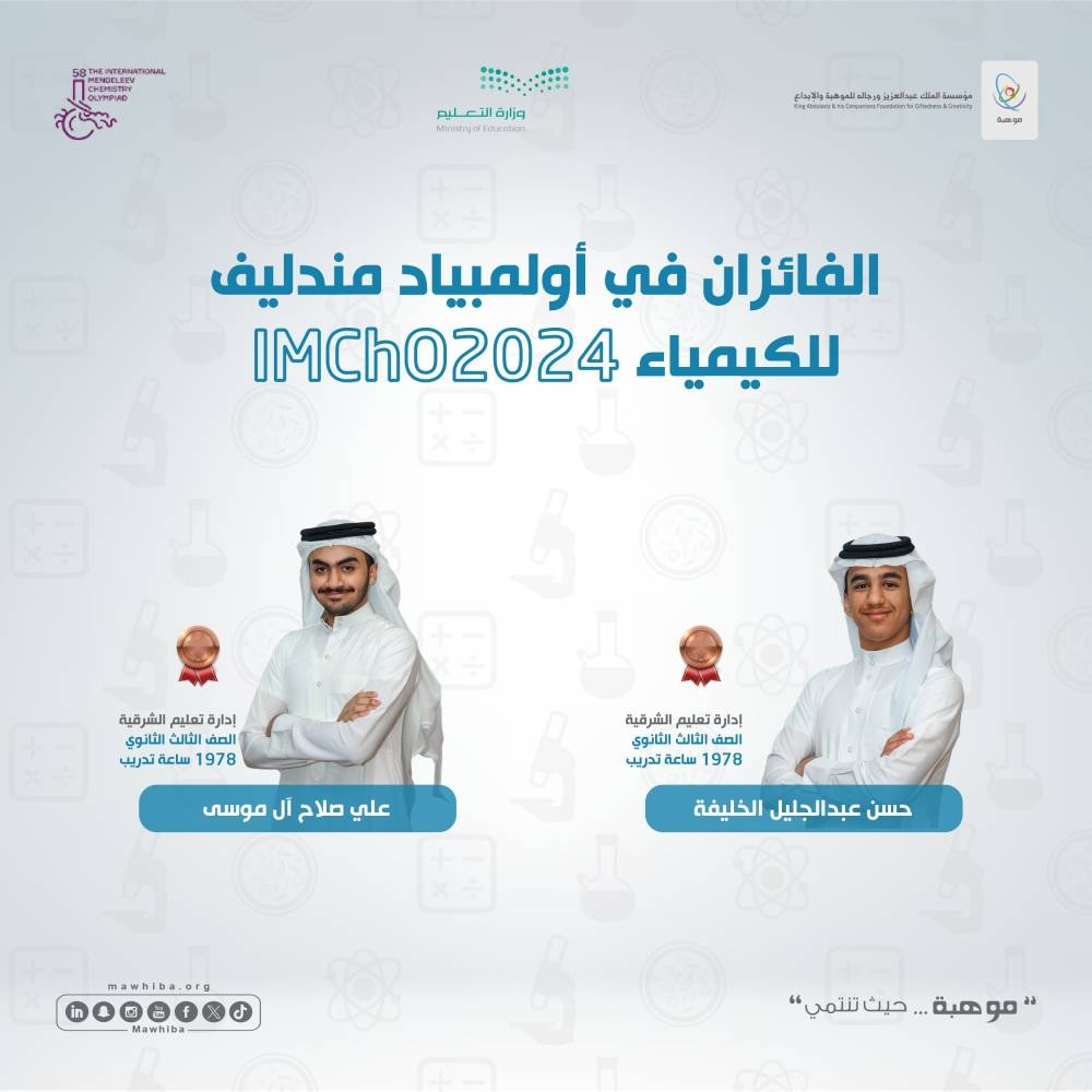 حصدت السعودية، ممثلة في مؤسسة الملك عبدالعزيز ورجاله للموهبة والإبداع (موهبة) ووزارة التعليم، جائزتين عالميتين في أولمبياد مندليف للكيمياء 2024، في دورته الـ58 التي أقيمت في جمهورية الصين الشعبية خلال الفترة من 20 إلى 27 أبريل الجاري.