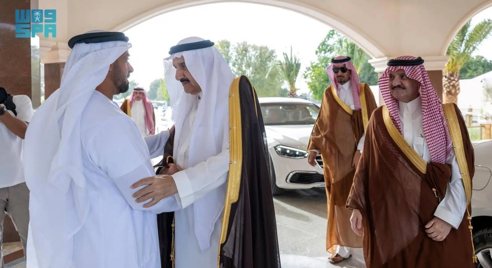 حضر الاستقبال سفير خادم الحرمين الشريفين لدى دولة الإمارات سلطان بن عبدالله العنقري، وسفير دولة الإمارات العربية المتحدة لدى المملكة الشيخ نهيان بن سيف بن محمد آل نهيان.