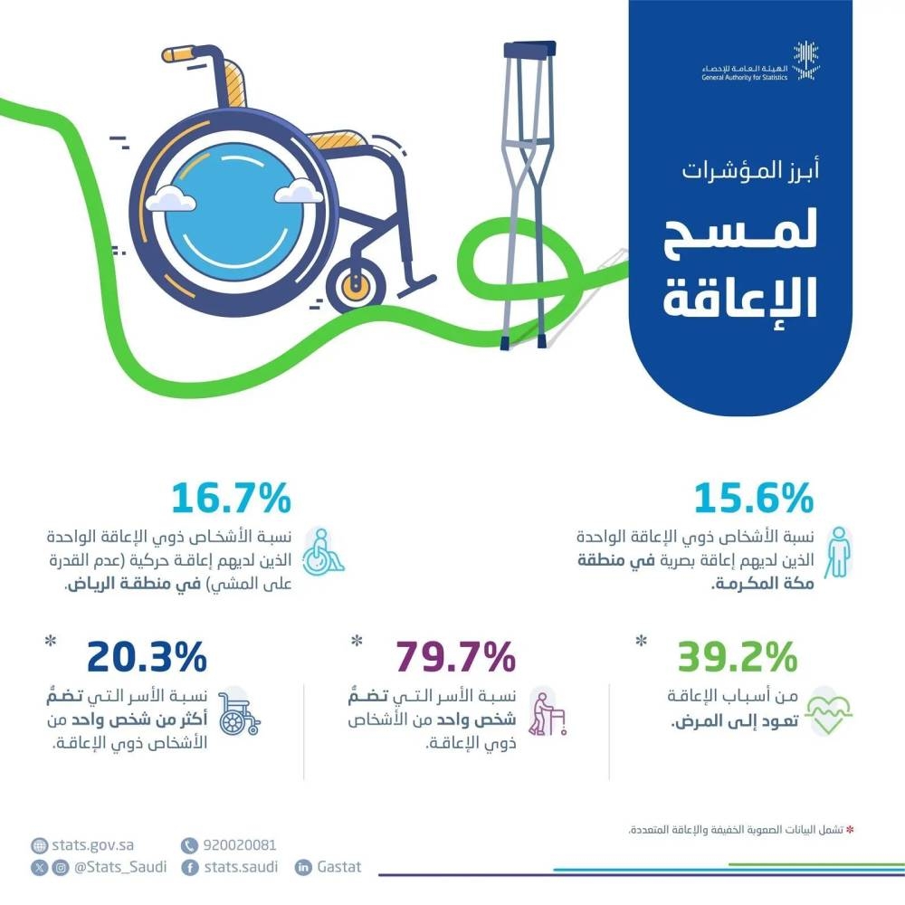 وأشارت إلى أن «مسح الإعاقة» يُعد أحد المسوح المتخصصة الوطنية التي تنفذها الهيئة لتوفير بيانات عن أنواع الإعاقة، وأسبابها، والخصائص العملية والديموغرافية للأفراد ذوي الإعاقة، وتوزيعهم الجغرافي.
