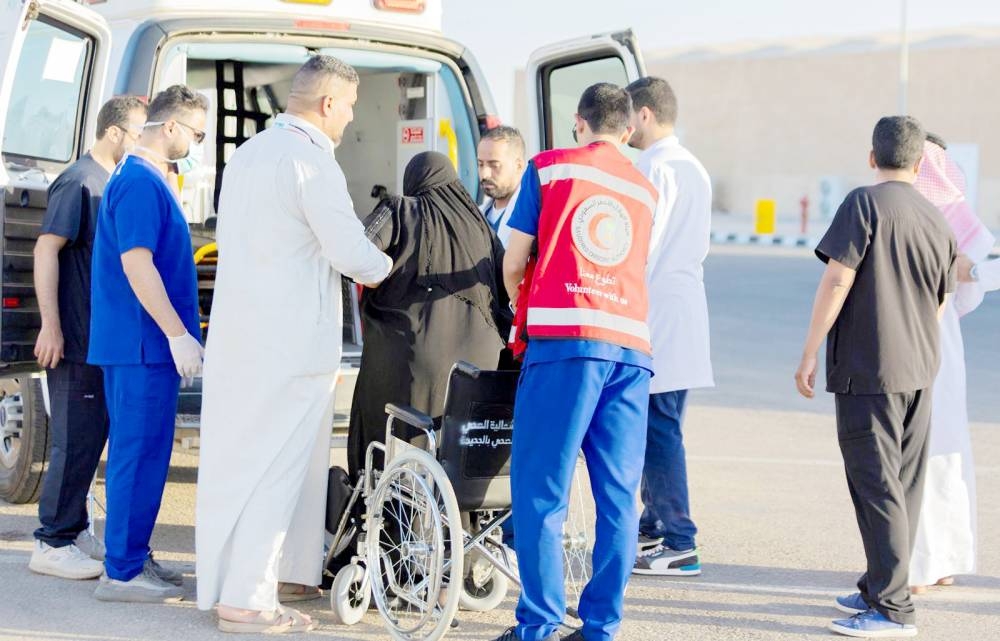 حاجة عراقية في منفذ جديدة عرعر تتلقى الرعاية الصحية بنقلها عبر سيارة إسعاف إلى المستشفى. (واس)