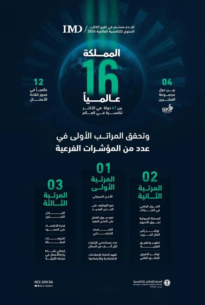 حققت السعودية المرتبة 16 عالميًا من أصل 67 دولة هي الأكثر تنافسية في العالم حسب تقرير الكتاب السنوي للتنافسية العالمية، الصادر عن مركز التنافسية العالمي التابع للمعهد الدولي للتنمية الإدارية (IMD)، الذي يعد واحدًا من تقارير التنافسية الرئيسة التي يتابعها ويحللها المركز الوطني للتنافسية بالتنسيق مع الجهات الحكومية ذات العلاقة.