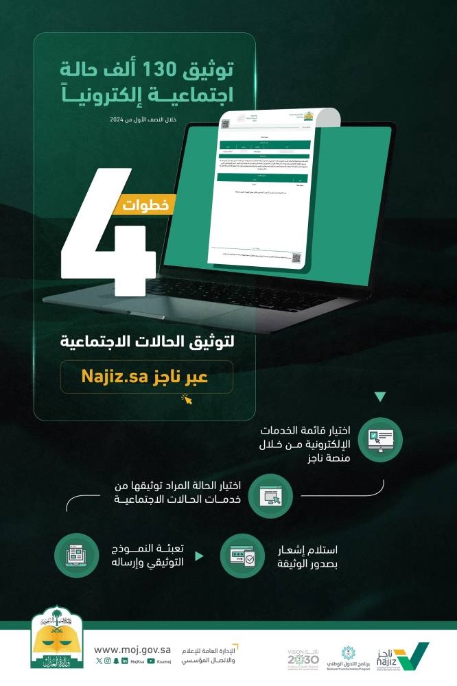 بلغ عدد عمليات الحالات الاجتماعية التي جرى توثيقها إلكترونياً عبر منصة «ناجز» للخدمات العدلية Najiz.sa، نحو 130 ألف حالة، خلال النصف الأول من العام الحالي 2024.