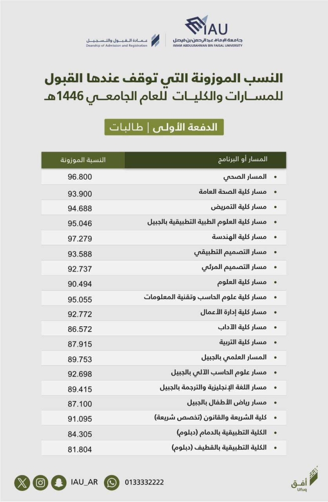 أعلنت جامعة الإمام عبدالرحمن بن فيصل ممثلة بعمادة القبول والتسجيل عن الدفعة الأولى من الطلاب والطالبات المرشحين والمرشحات للقبول في المسارات والبرامج للعام الجامعي 1446هــ، من أصل 74 ألف طالب وطالبة.