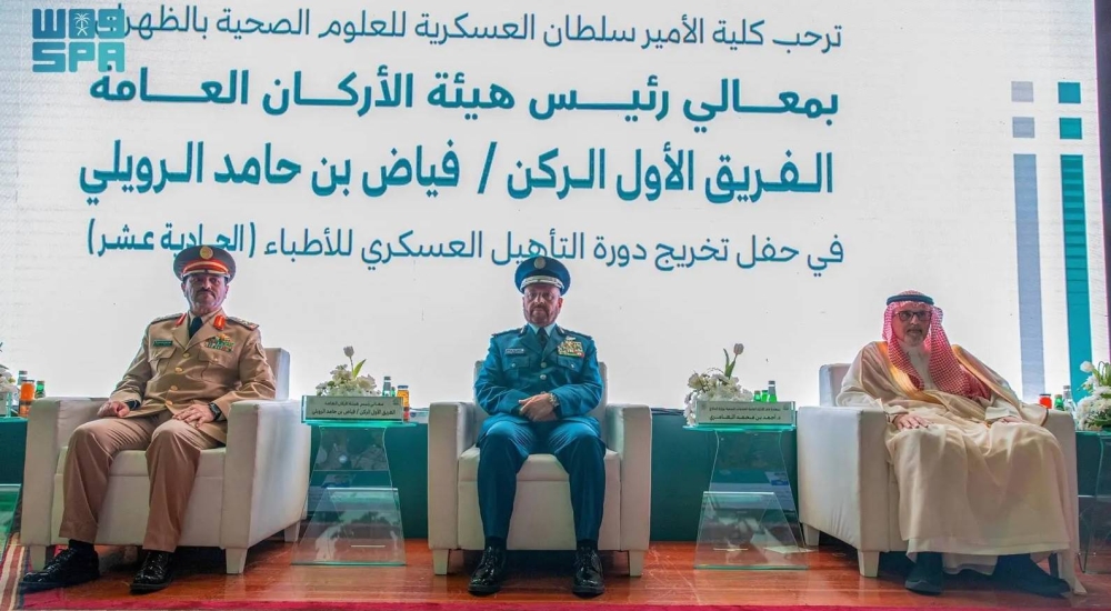نيابةً عن وزير الدفاع الأمير خالد بن سلمان بن عبدالعزيز، رعى رئيس هيئة الأركان العامة الفريق الأول الركن فياض بن حامد الرويلي اليوم حفل تخريج دورة التأهيل العسكري للأطباء الجامعيين الـ11 من طلبة كلية الأمير سلطان العسكرية للعلوم الصحية بالظهران.
