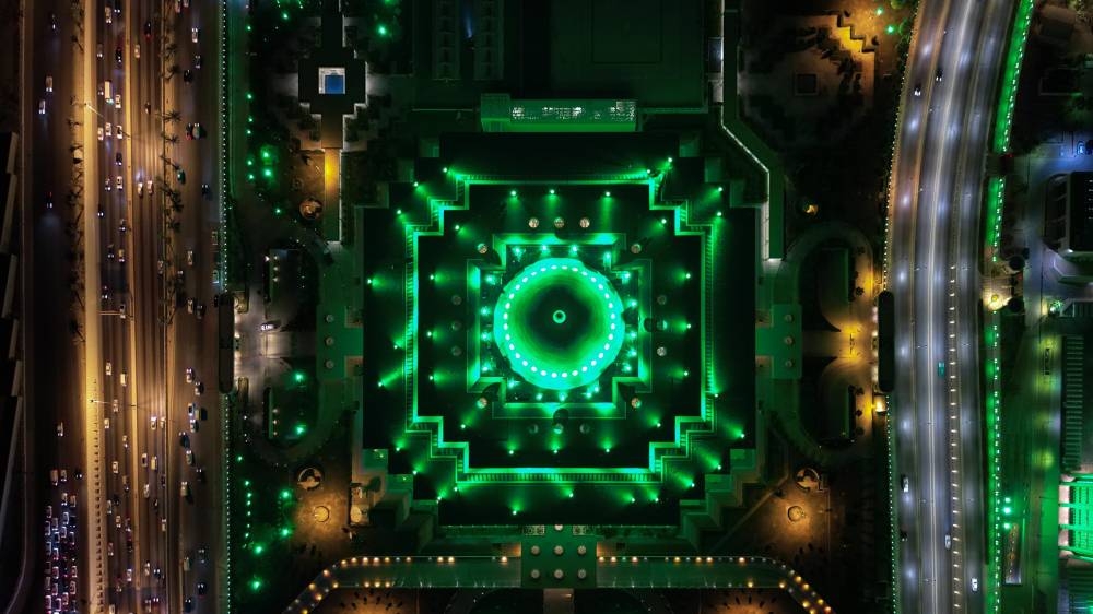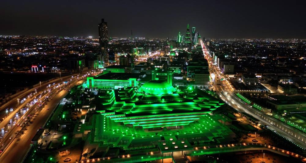 اكتسى مبنى وزارة الداخلية في الرياض، الذي يعد من أبرز معالم العاصمة لما يتميز به من تصميم هندسي جذاب ومميز، باللون الأخضر ابتهاجًا بمناسبة ذكرى اليوم الوطني الـ(94) للمملكة.
