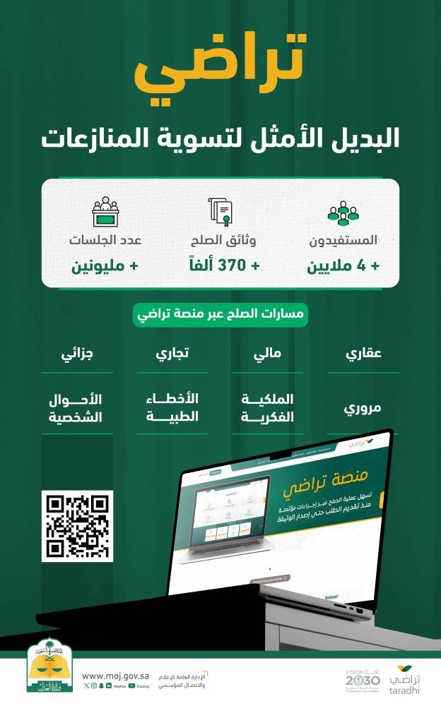 عمل مركز المصالحة في وزارة العدل على تقديم خدمات الصلح عبر منصة «تراضي» الرقمية في إجراءات إلكترونية بالكامل اختصرت الوقت والجهد على المستفيدين.