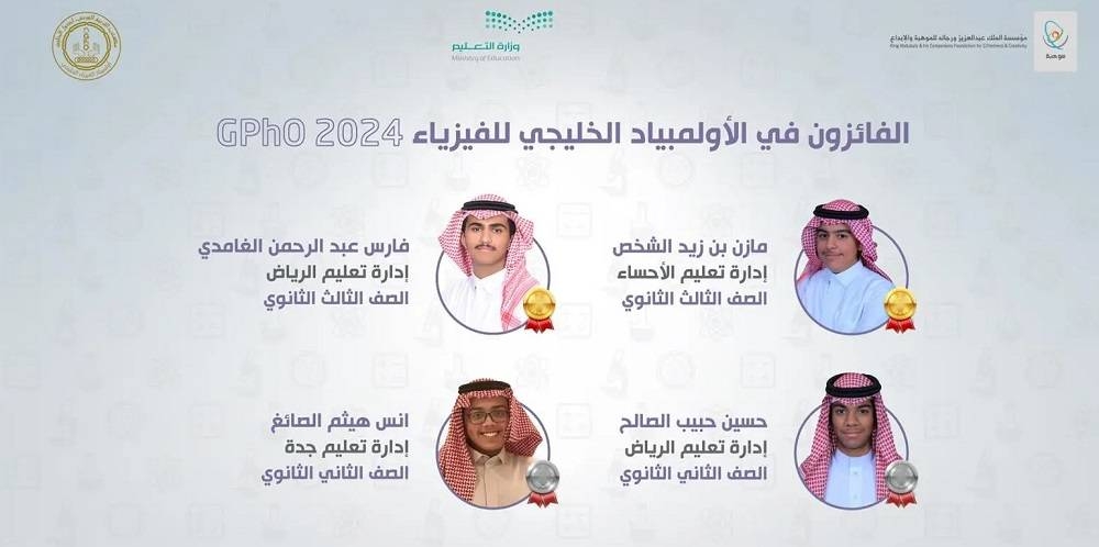 وحصل المنتخب السعودي للفيزياء على 4 ميداليات، إذ حاز الطالبان مازن الشخص، من إدارة تعليم الأحساء، وفارس الغامدي، من إدارة تعليم الرياض، على ميداليتين ذهبيتين، فيما نال الطالبان حسين الصالح، من إدارة تعليم الرياض، وأنس الصائغ، من إدارة تعليم جدة، ميداليتين فضيتين.