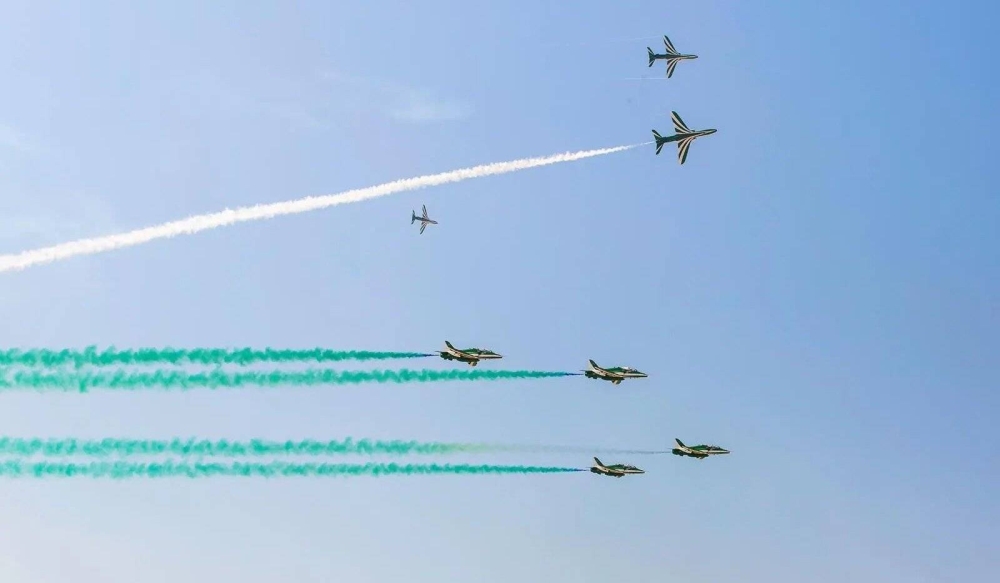 وتميزت الاستعراضات التي قدمها فريق الصقور السعودية بالتناغم والدقة، ونالت بمجموعة من التكوينات الجوية والمناورات المعقدة ترحيب الجماهير الحاضرة، فيما قدمت طائرتا «تايفون» عروضاً جوية انفرادية باحترافية عالية، وعروضاً أرضية مع طائرة «ف - ١٥ إس أي» بطلاء اليوم الوطني السعودي الـ 94.