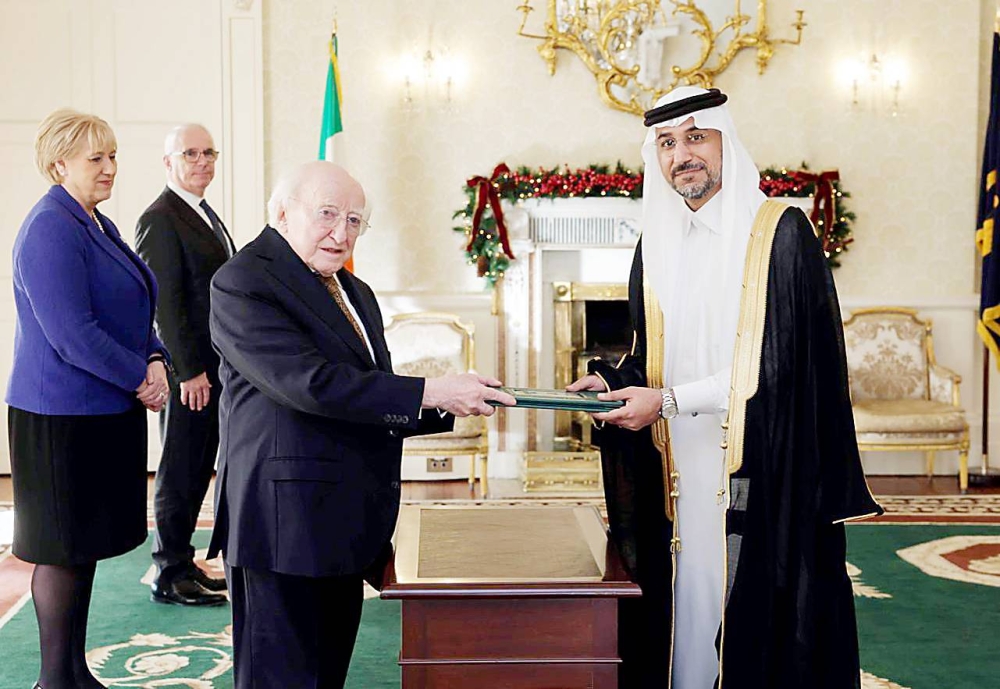 قدم سفير خادم الحرمين الشريفين لدى إيرلندا حسن سعيد الجميع، أمس، أوراق اعتماده إلى رئيس إيرلندا مايكل دي هيغينز، وذلك خلال المراسم التي أقيمت بالقصر الرئاسي بالعاصمة دبلن.