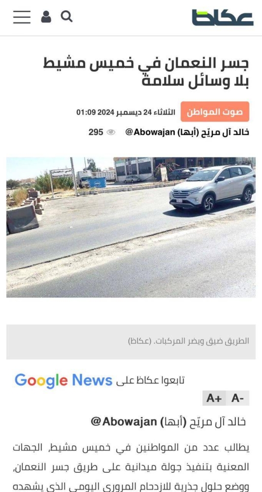 تجاوباً مع المادة الصحفية التي نشرتها «عكاظ» أمس (الثلاثاء) بعنوان (جسر النعمان في خميس مشيط بلا وسائل سلامة)، أوضح رئيس بلدية المحافظة المهندس عوض ملفي القحطاني، أن البلدية لا تألو جهداً في أعمال صيانة ومتابعة هذا الطريق أُسوة بباقي طرق المحافظة إذ تتم معالجة أي ملاحظة على هذا الطريق بشكل فوري وفي حينها، كما يتم التنسيق مع الجهات الأخرى ذات الاختصاص، كإدارة المرور أثناء الازدحام المروري خلال أوقات الذروة، وفي ما يتعلق بازدواجية الطريق، فهو ضمن اهتمامات البلدية، وسيكون من ضمن الأولويات وحسب الاعتمادات المالية.