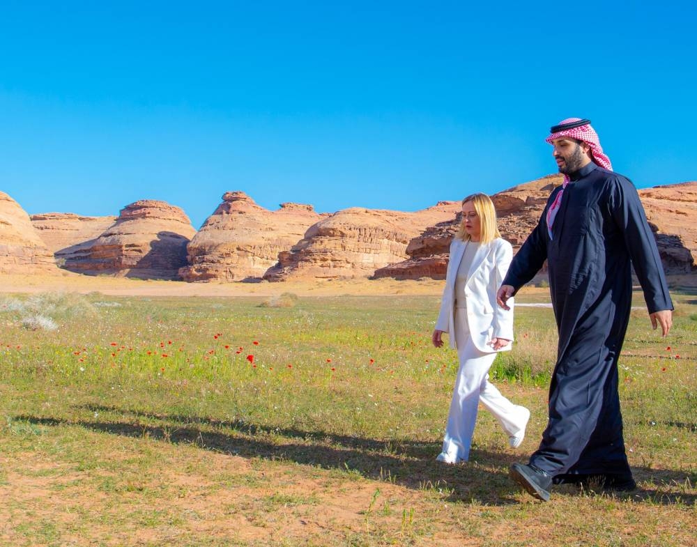 استقبل ولي العهد رئيس مجلس الوزراء الأمير محمد بن سلمان بن عبدالعزيز آل سعود، في المخيم الشتوي في العلا، اليوم دولة السيدة جورجيا ميلوني رئيسة وزراء الجمهورية الإيطالية.