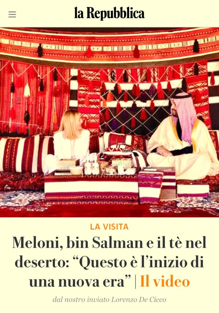 تناولت صحيفة «لا ريبوبليكا»، واحدة من أكبر الصحف الإيطالية، تفاصيل اللقاء، مشيرةً إلى أن لقاء ولي العهد السعودي مع رئيسة الوزراء وتناول الشاي في الصحراء يمثل بداية عصر جديد. وكشفت الصحيفة، التي تصدر من روما، أن الشركات الإيطالية ستوقع أولى اتفاقياتها في السعودية، التي خصصت لها رئيسة الوزراء قيمة تصل إلى 10 مليارات دولار. وتعتبر الاتفاقيات إطارية عامة، ما يعني أنها تمهد الطريق لاستثمارات مستقبلية كبيرة.
