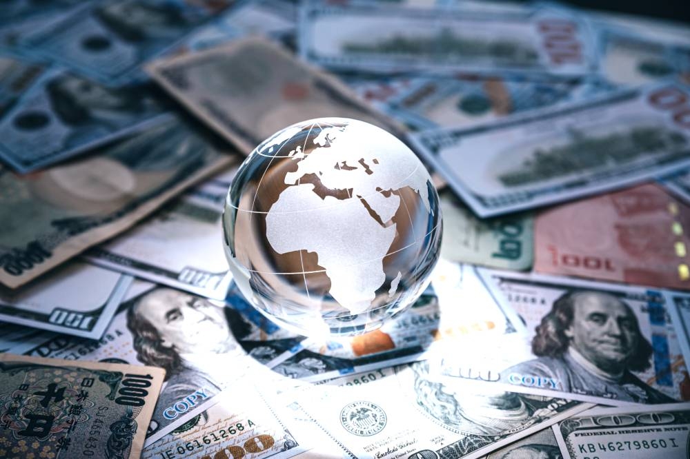 Crystal globe on many currency, World bank, Economic inflation conditions where tend to increase continuously.