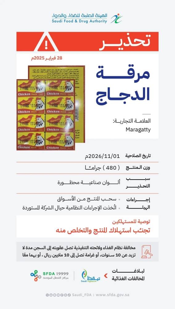 أصدرت الهيئة العامة للغذاء والدواء تحذيراً من منتج مرقة الدجاج للعلامة التجارية (Maragatty)، بلد المنشأ: جمهورية مصر العربية، المعبأ في عبوات تزن 480 غراماً، ويحمل تاريخ صلاحية 1/11/2026، وذلك لاحتوائه على ألوان صناعية محظورة (Dimethy1 Yellow, Sudan I, Sudan IV)، التي يُمنع استخدامها في المنتجات الغذائية لما قد تسببه من آثار سلبية على صحة المستهلك.