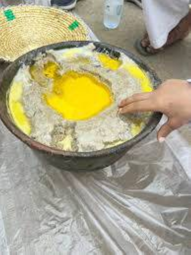 وتمتد مائدة الإفطار لبضعة أمتار، تتوزع فيها الآنية المليئة بأنواع المأكولات الشعبية التي عُرفت بها المنطقة، والتي تحظى باهتمام كبير في مثل هذه المواسم، إذ يُحضر كل شخص وجبته الخاصة، التي تتكون من الأكلات الشعبية المفضلة لديهم، ومن أبرزها «الحيسية»، التي تكون عادة من الطعام الحلو المكون من الذرة أو الدخن الممزوج باللبن والسمن المضاف إليه السكر أو العسل، ويفضل آخرون أن تكون من الطبق المالح المكون من المرق والخمير واللحوح مع اللحم أو الدجاج.